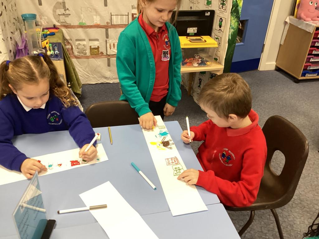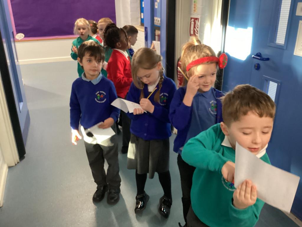 On Tuesday, we explored how words are everywhere! The children took part in a word hunt around the school, played a ‘silly sentence’ game to create their own sentences and short stories, and made word wands to proudly show off their favourite words.